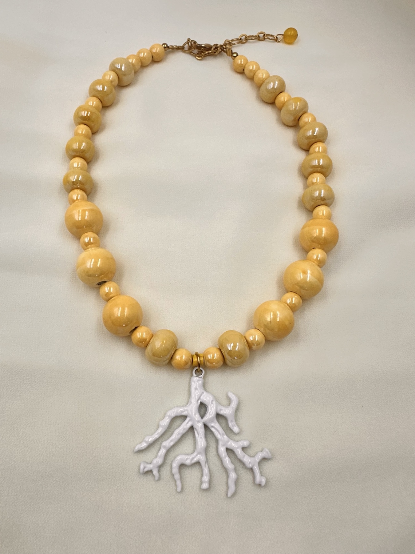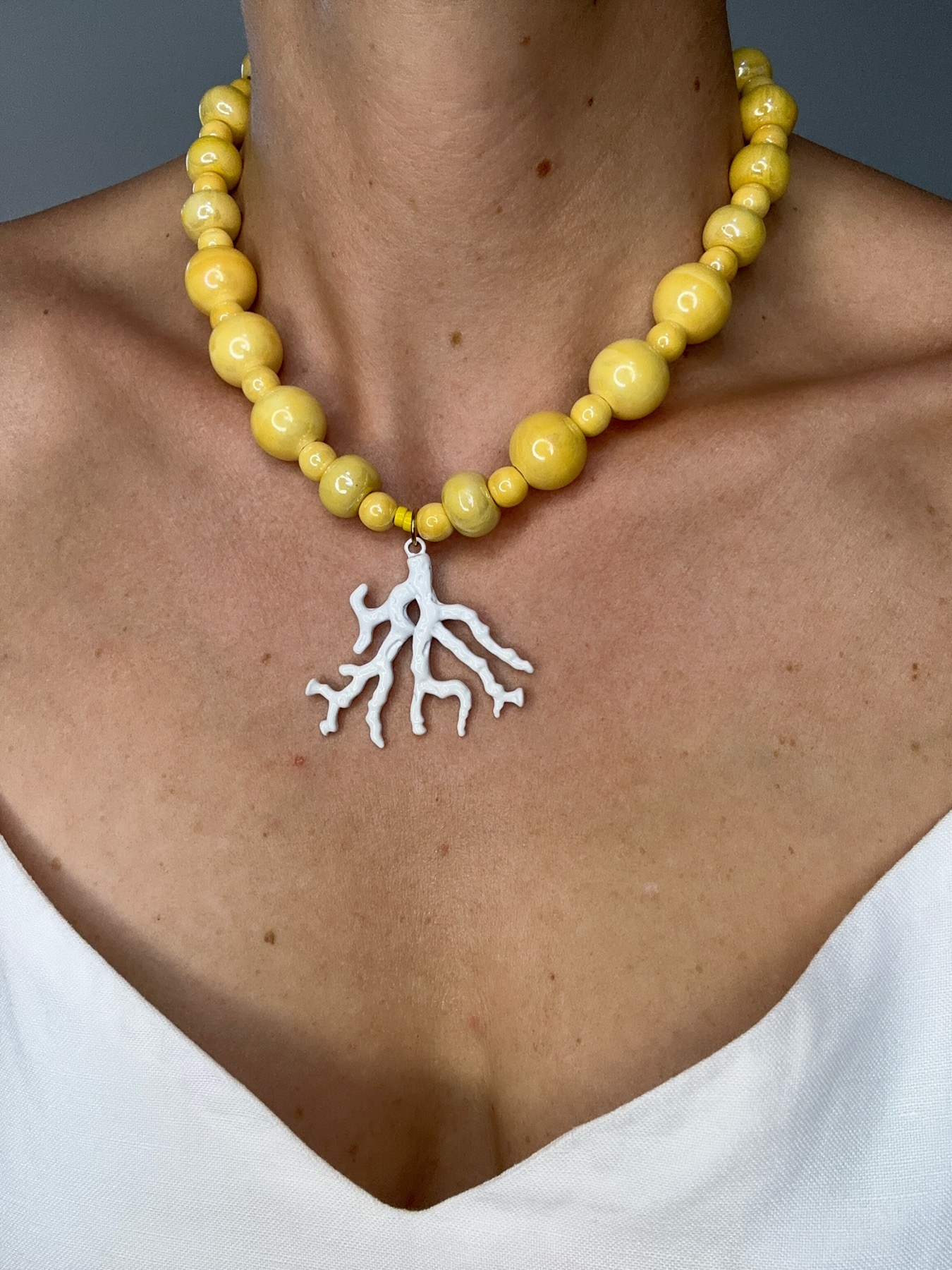 Χειροποίητο statement κολιέ με μεγάλες κεραμικές χάντρες σε pastel κίτρινο, που αποπνέει ζωντάνια και θετική ενέργεια.