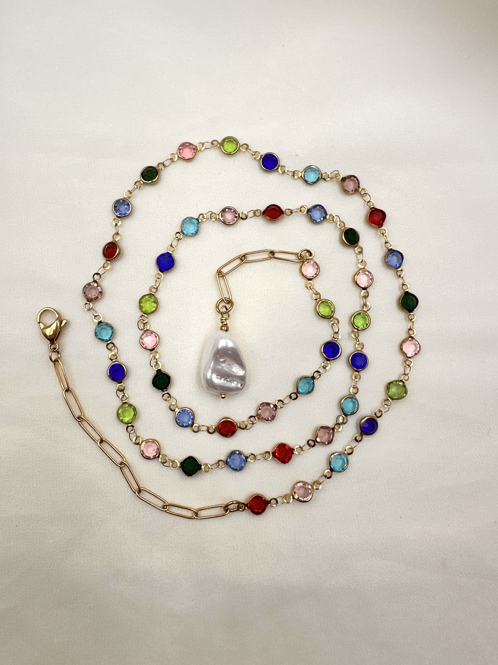 Κολιέ με ατσάλινη επιχρυσωμένη αλυσίδα, πολύχρωμα κρύσταλλα και λευκό μαργαριτάρι πάστα. Φοριέται μονό ή διπλό, για statement και chic εμφανίσεις.