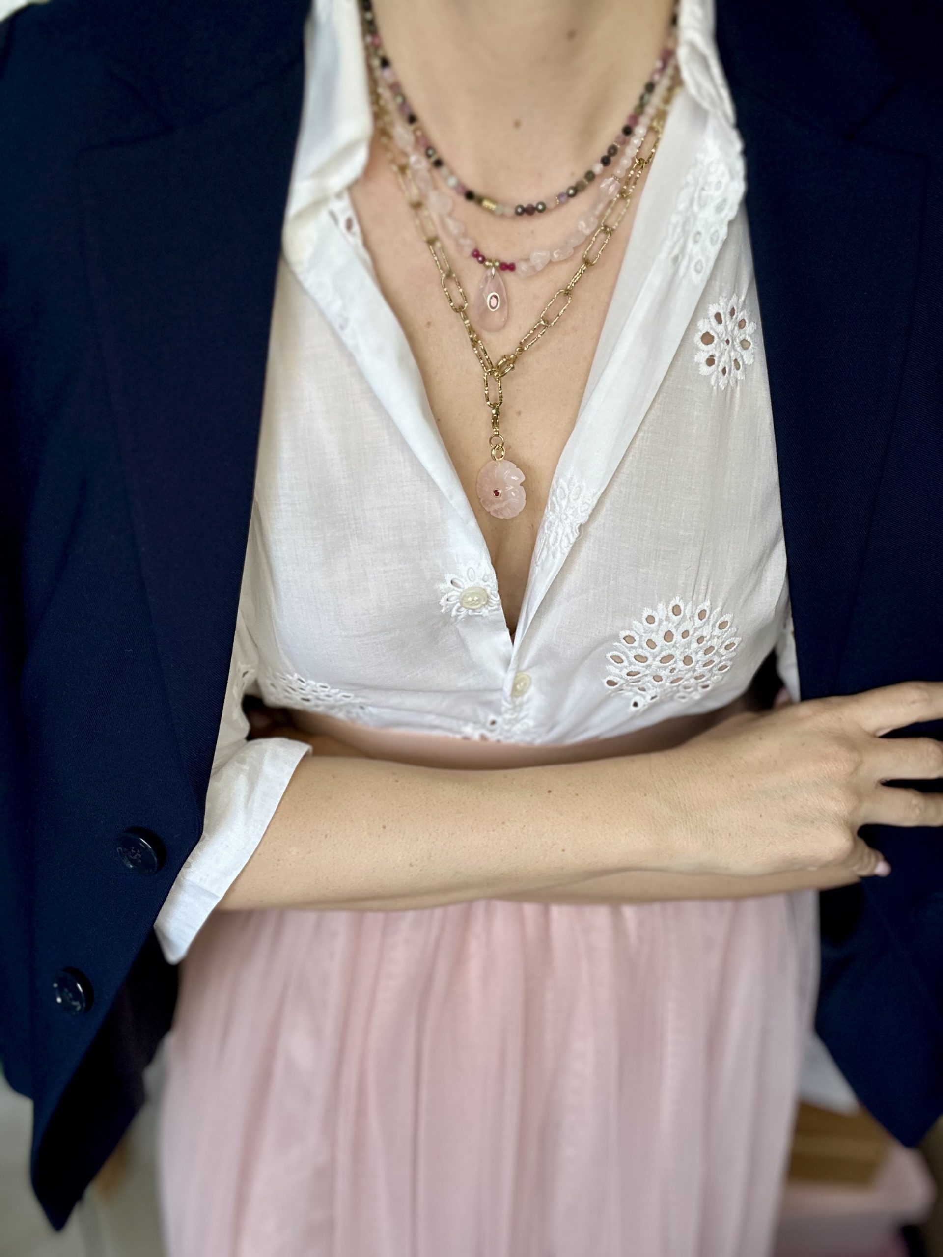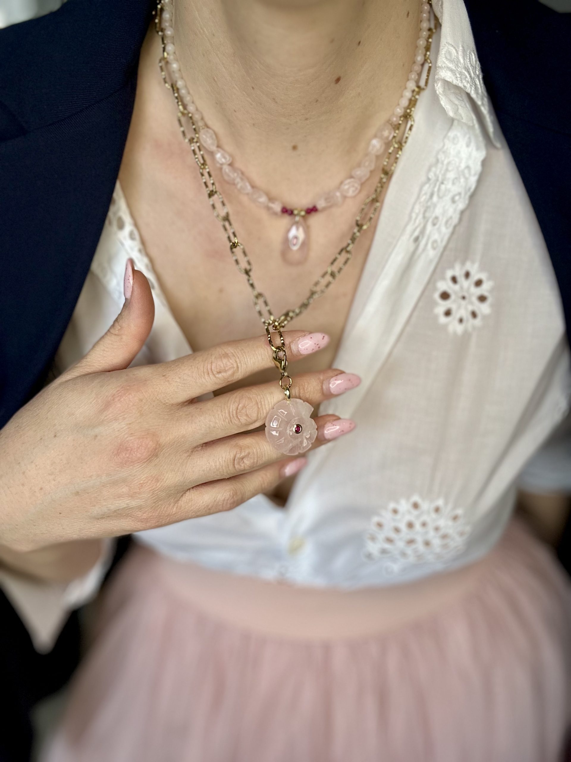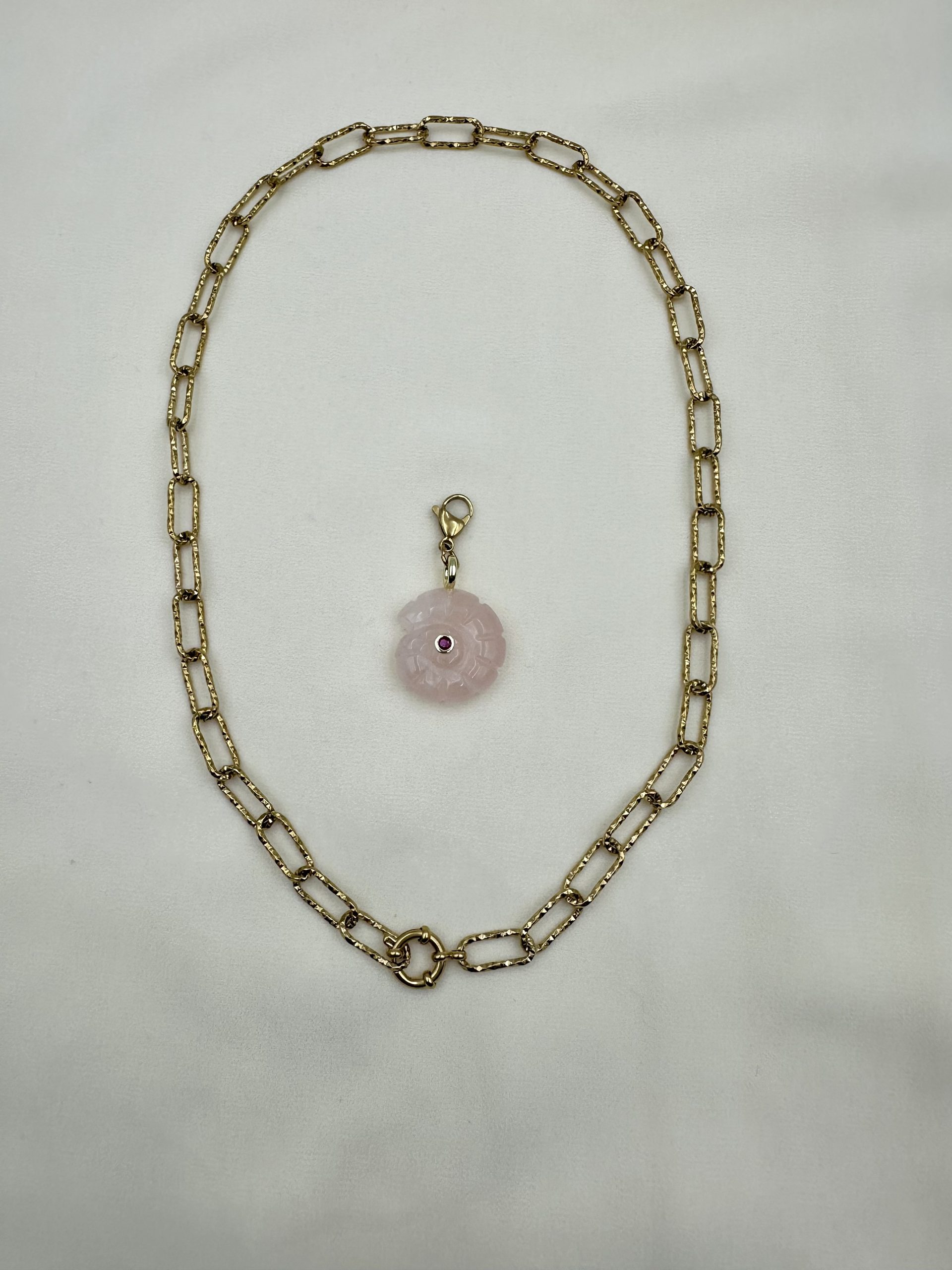 Η επιχρυσωμένη ατσάλινη αλυσίδα δίνει χαρακτήρα και ένταση, ενώ το ροζ στοιχείο από χαλαζία φωτίζει διακριτικά το ντεκολτέ με μια αίσθηση θηλυκής ηρεμίας.