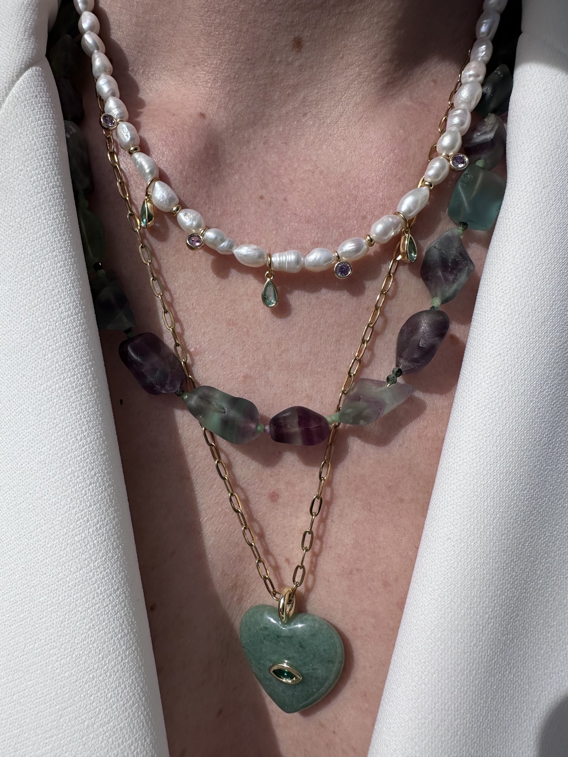 Κάθε πέτρα είναι διαφορετική — άλλες πιο φωτεινές, άλλες πιο βαθιές — δημιουργώντας ένα παιχνίδι χρωμάτων που αλλάζει διακριτικά με το φως και την κίνηση.