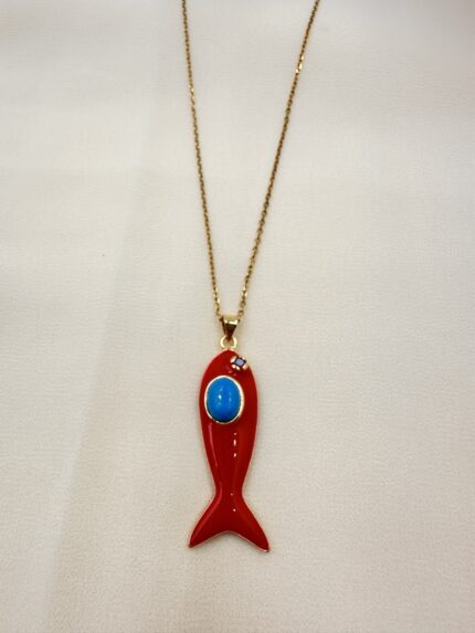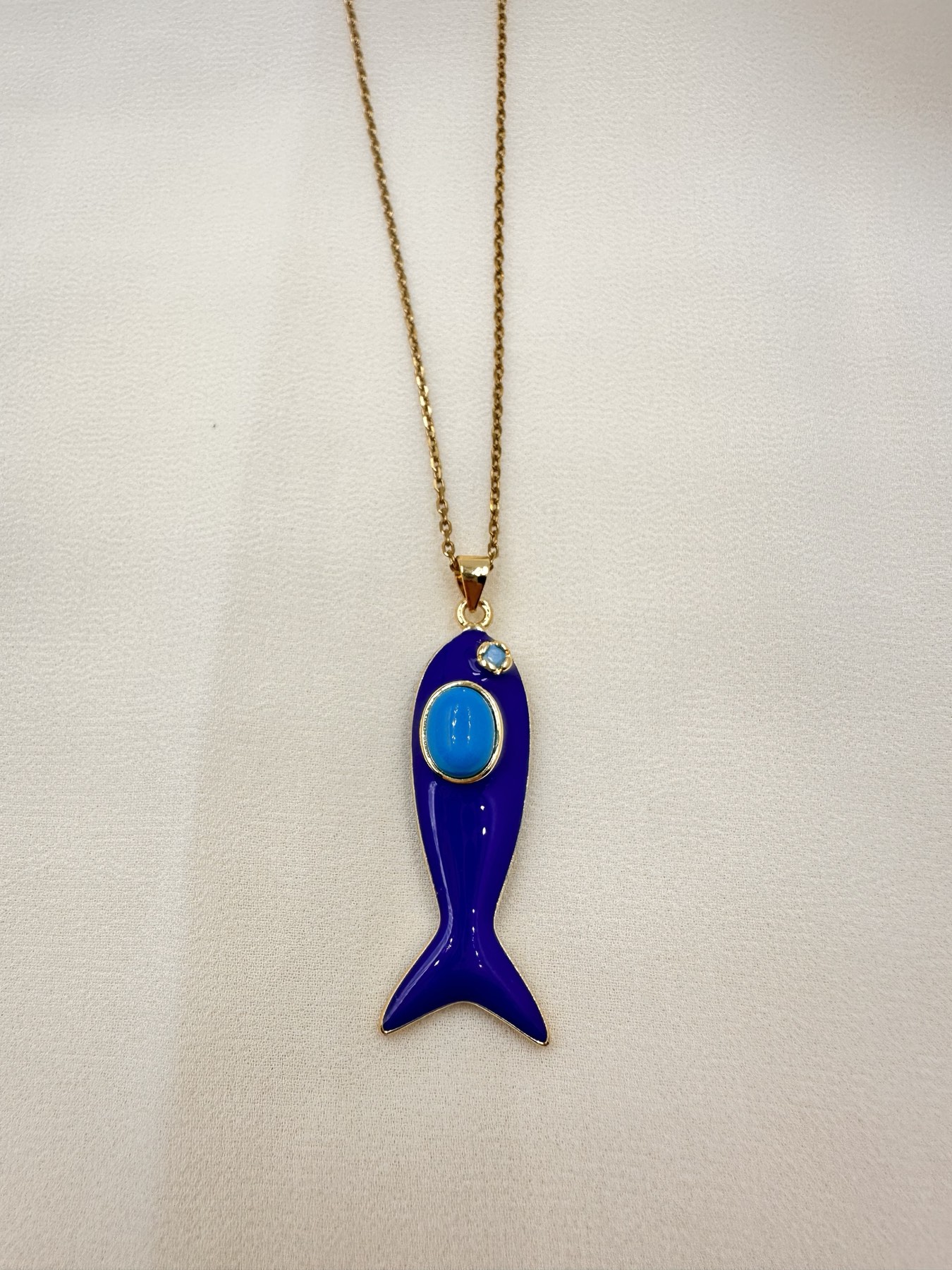 Ένα κομψό και παιχνιδιάρικο κολιέ σε σχήμα ψαριού, με έντονο μπλε και διακοσμημένο με τιρκουάζ ημιπολύτιμη πέτρα στο κέντρο.