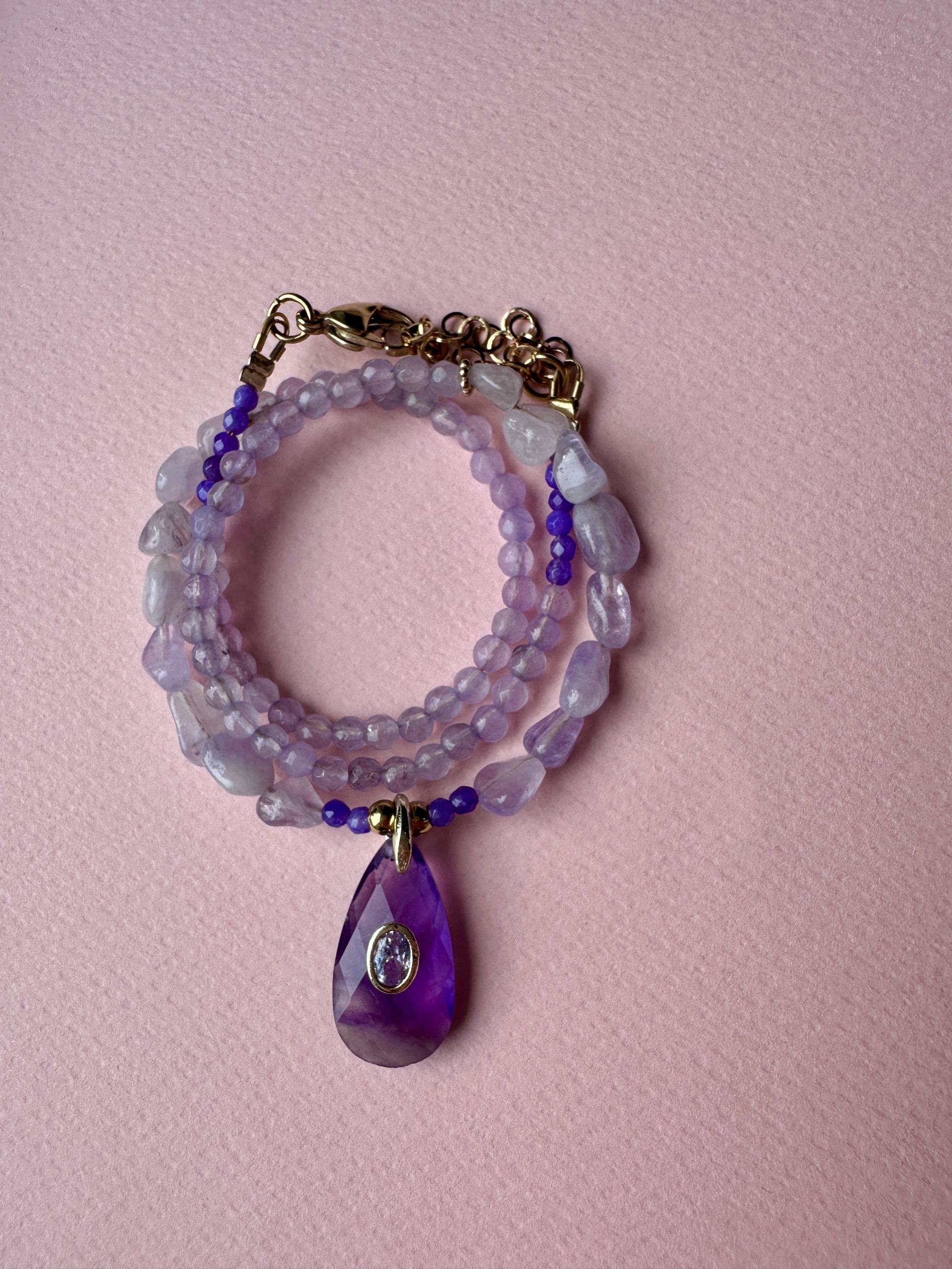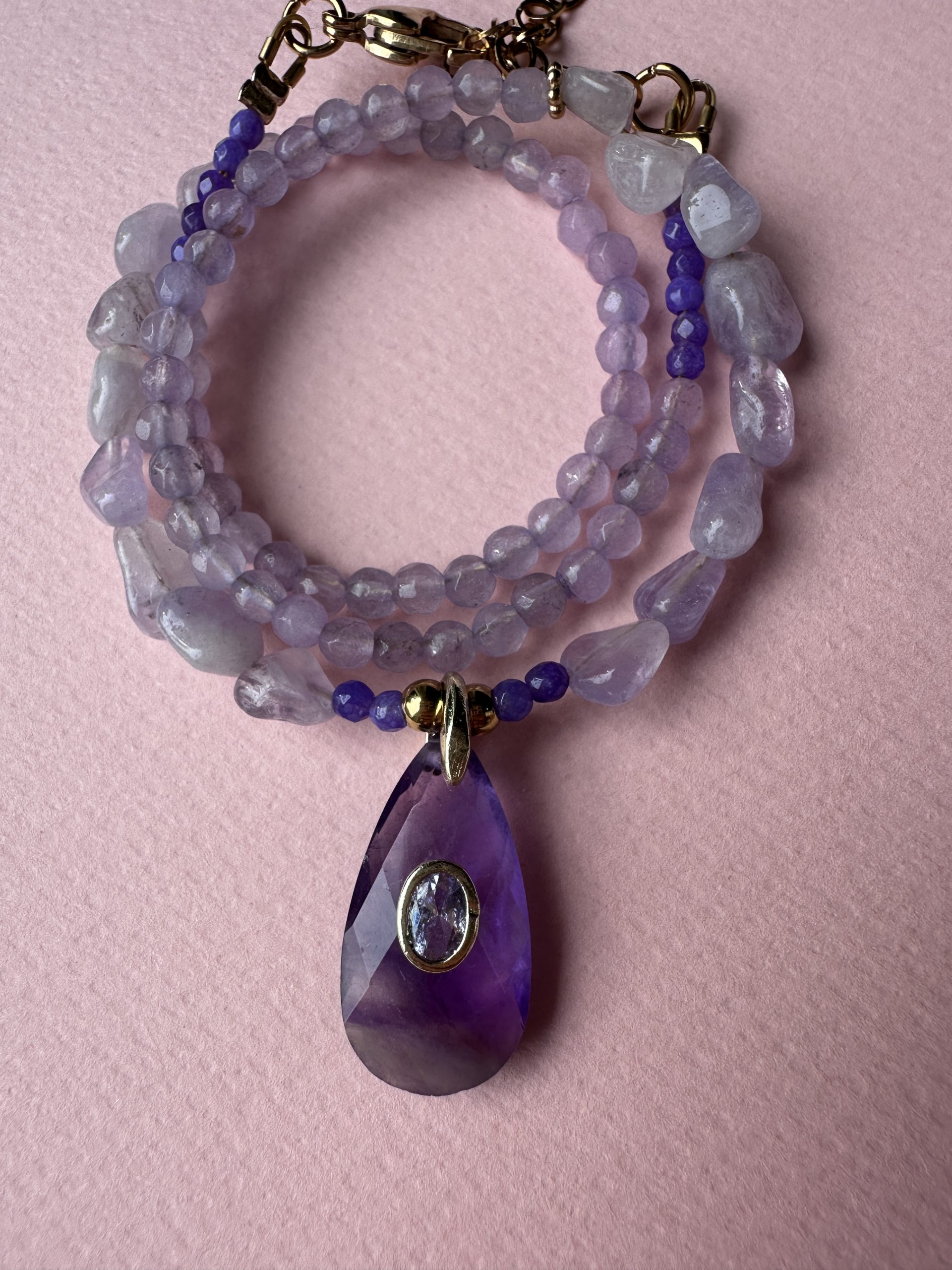 Ένα χειροποίητο κολιέ με εντυπωσιακή σταγόνα αμέθυστου, δεμένο αρμονικά με ημιπολύτιμες πέτρες αχάτη.