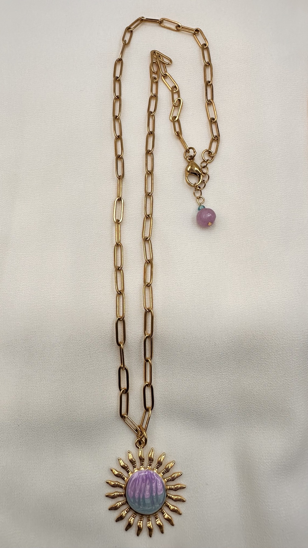 Μενταγιόν ατσάλινο με μακριά αλυσίδα σε σχήμα ήλιου στα χρώματα του ηλιοβασιλέματος .
