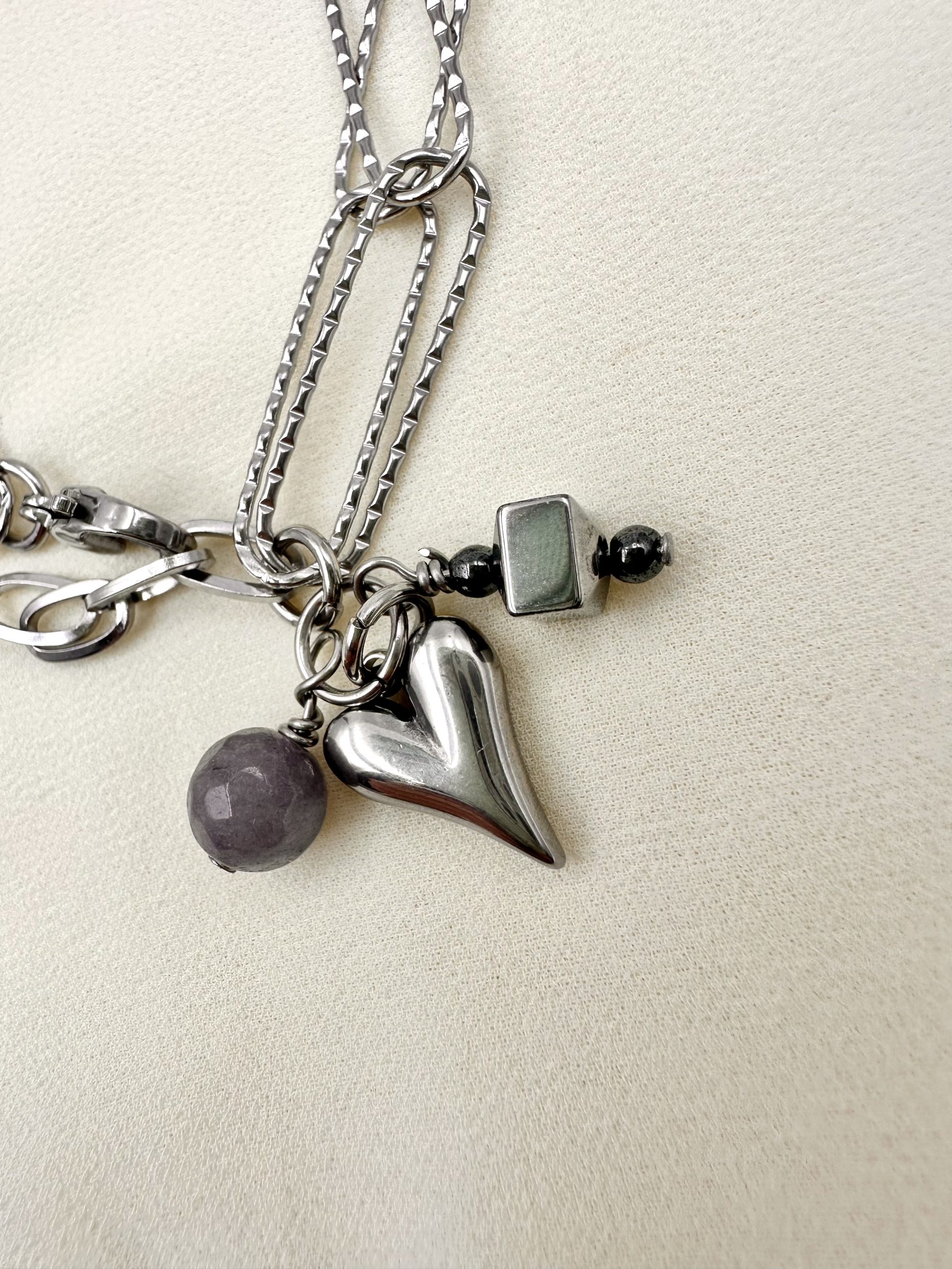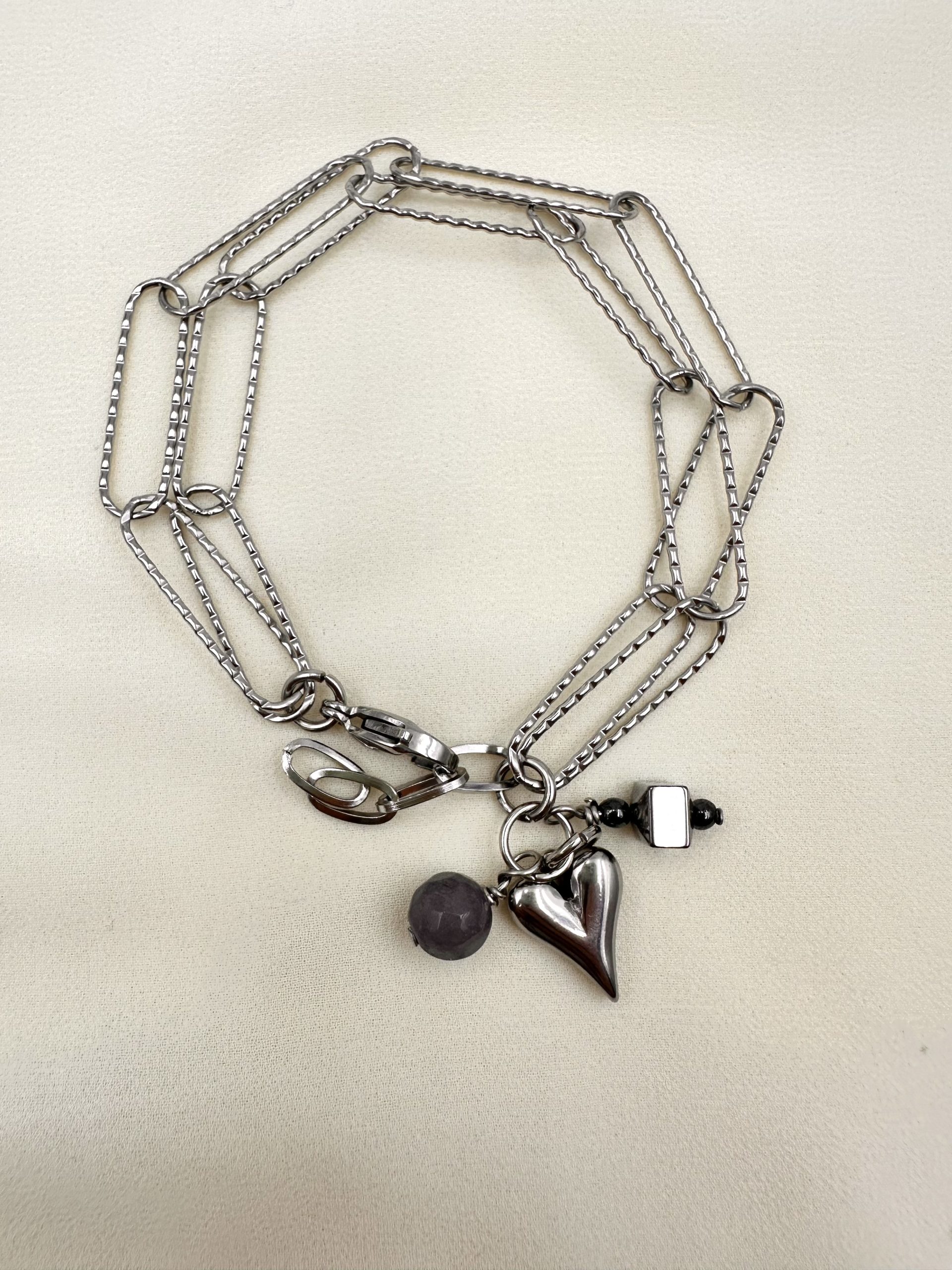 Συνδυάζει διπλή paperclip αλυσίδα σε ψυχρό ασημί τόνο με τρία μοναδικά charms: μια γυαλιστερή μεταλλική καρδιά, μια ματ γκρι πέτρα αχάτη και ένα στοιχείο αιματίτη .