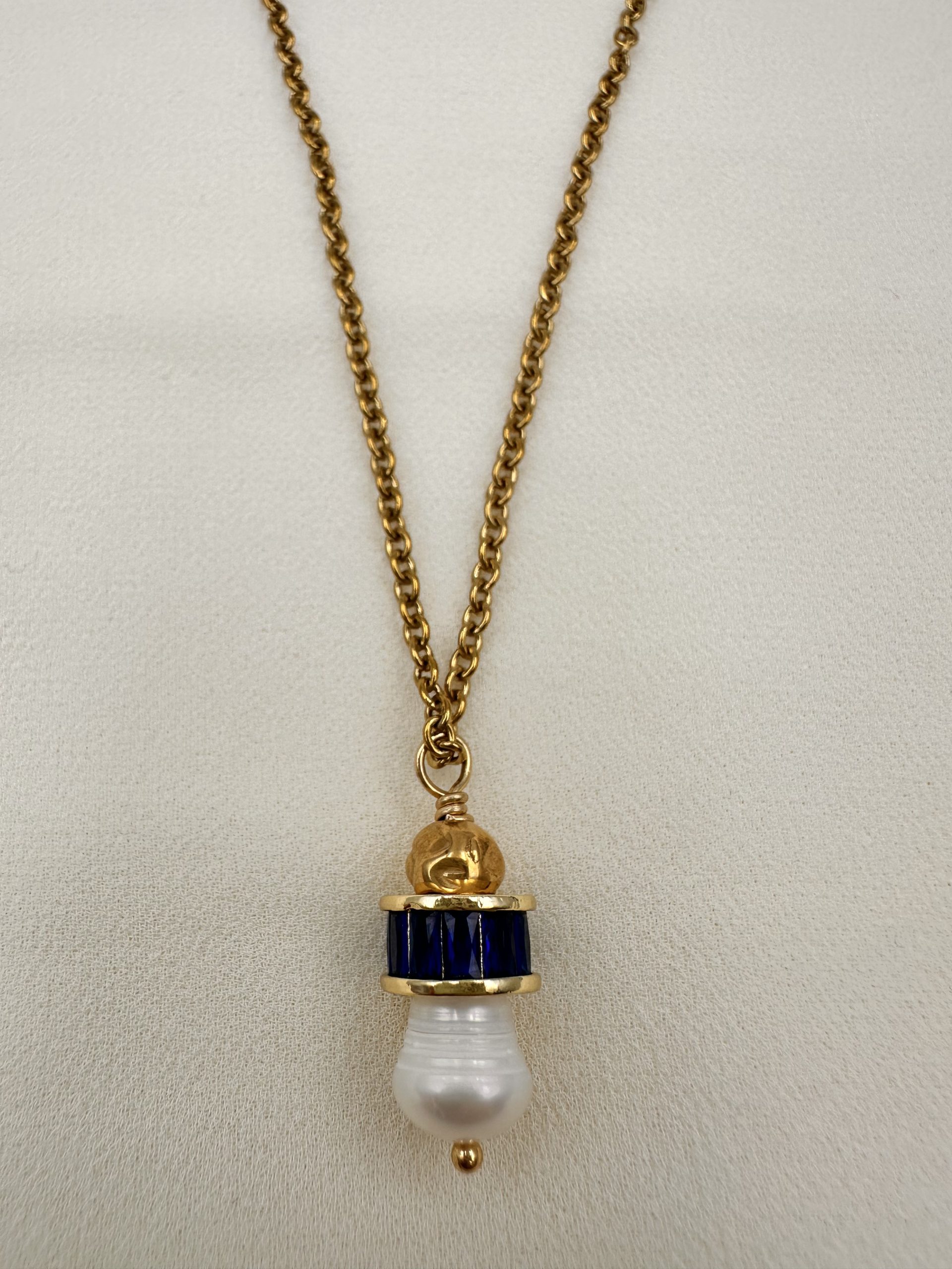 Ένα κομψό κολιέ με κυλινδρικό ζιργκόν και αληθινό μαργαριτάρι σε ατσάλινη αλυσίδα που αιχμαλωτίζει το φως σε κάθε κίνηση.