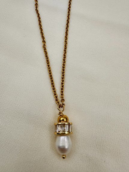 Ένα κομψό κολιέ με κυλινδρικό ζιργκόν και ατσάλινη αλυσίδα που αιχμαλωτίζει το φως σε κάθε κίνηση.